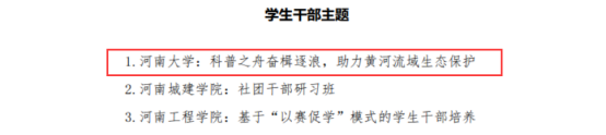 2022年2月26日,在河南省教育厅公布的关于2021年全省高校学生社团品牌建设系列活动中,春桐学社以“科普之舟奋楫逐浪,助力黄河流域生态保护”为题的学生干部主题案例成功入选学生社团优秀工作案例。