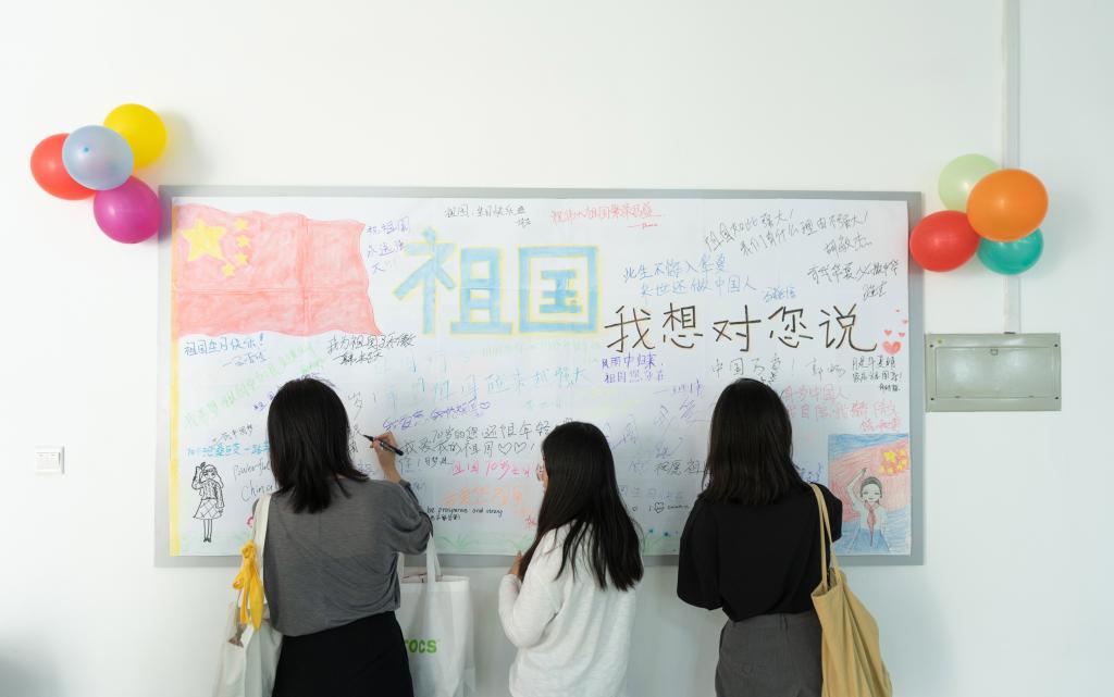 参与活动的老师与学生在留言墙上写下对祖国的祝福。