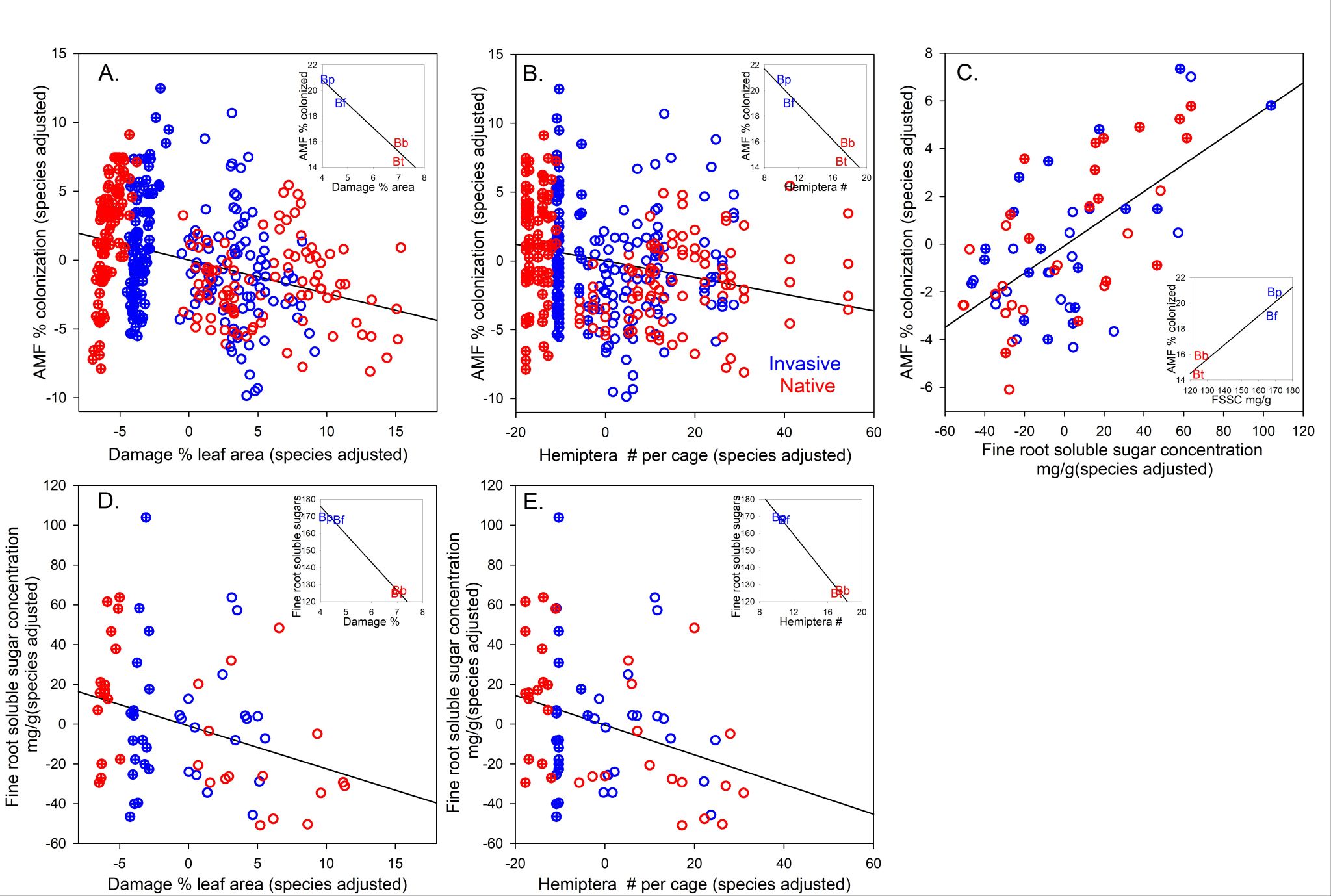 研究结果显示,野外调查实验中,入侵植物表现出较低的叶片损伤和半翅目昆虫丰度,同时AMF定殖率更高,根部更细且表面积更大,可溶性糖浓度也更高。随着纬度的增加,本地近缘植物的叶片损伤逐渐减少,而入侵植物的叶片损伤则相对稳定。同质园实验结果与野外调查实验表现一致。综合分析表明,入侵植物之所以能够成功,一方面是因为它们受到的地上昆虫取食压力较小,这直接促进了它们的生长;另一方面,这种取食压力的减弱通过根部可溶性糖的积累,间接增强了它们与AMF的共生关系,从而进一步提高了它们的竞争力。入侵植物在根部形态特征的优势,有助于它们在资源获取上超越本地植物。