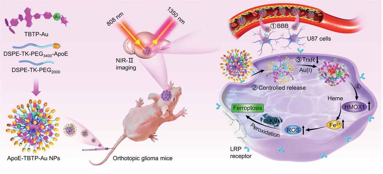 铁死亡是一种新型的细胞死亡方式,有望为脑胶质瘤的安全高效诊疗提供新的机会,但是现有的铁死亡剂的特异性激活效率低且缺乏高效的体内示踪功能。近红外二区(1000-1700 nm)聚集诱导发光(Aggregation-induced emission, AIE)活体荧光成像技术具有穿透深、聚集增强、信噪比高、实时成像的优势,是一项高效的辅助研究纳米药物体内代谢及分布的先进示踪技术。实验室基于脑胶质瘤特点和AIE示踪技术优势,首次开发具有可视化近红外二区荧光成像功能与高特异性铁死亡Au(I)活性中心于一体的脑靶向铁死亡剂,利用其与肿瘤高表达的硫氧还蛋白还原酶(TrxR)特异性结合,不仅有效监测纳米药物的血脑屏障穿透及体内分布,而且特异性激活TrxR-HMOX1介导的非经典铁死亡通路,实现对脑胶质瘤的有效抑制并延长小鼠生存周期。该研究为开发更多的下一代先进可视化纳米药物提供了重要借鉴。