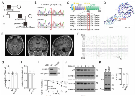 图2. LGI1W183R突变的遗传和表达分析