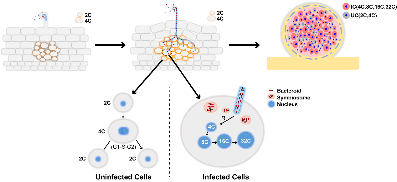 图1 大豆结瘤发育过程中,根瘤菌侵染4C细胞并触发其细胞核内复制,产生高倍性细胞