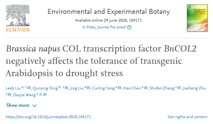 2020年6月29日,诸侯快讯ok1133.com/省部共建作物逆境适应与改良国家重点实验室王道杰课题组在Environmental and Experimental Botany 在线发表题为“Brassica napus COL transcription factor BnCOL2 negatively affects the tolerance of transgenic Arabidopsis to drought stress”的研究论文。本研究通过对油菜FOX拟南芥库进行筛选与鉴定,得到干旱响应关键基因BnCONSTANS-LIKE2(BnCOL2),进而揭示BnCOL2可能通过影响ABA信号通路及干旱胁迫相关基因的表达负调控植物对干旱胁迫的耐受性。