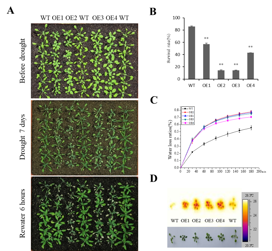 在前期研究中,我们利用RNA-seq筛选获得了70个受非生物胁迫显著诱导的差异表达油菜基因。本研究通过FOX hunting system构建了这70个DEGs的过表达拟南芥库。为了获得油菜响应非生物胁迫的关键基因,我们对这些油菜-FOX-拟南芥库进行了筛选。经过筛选和鉴定共获得20个胁迫响应的油菜基因,其中过表达BnCOL2基因拟南芥在干旱胁迫下叶片温度与WT有显著差异。据此推测转基因拟南芥可能参与干旱胁迫响应。进一步研究发现,BnCOL2是一个具有转录激活活性的核定位转录因子,BnCOL2主要在叶中表达且受PEG6000诱导下调表达。BnCOL2过表达拟南芥种子萌发及萌发后幼苗阶段的抗逆性分析结果表明,在PEG6000处理下,与野生型拟南芥相比,过表达BnCOL2显著降低转基因拟南芥渗透胁迫的耐受性。基因表达分析表明,BnCOL2可能通过影响干旱胁迫相关基因的表达进一步参与了植物对干旱胁迫的响应。