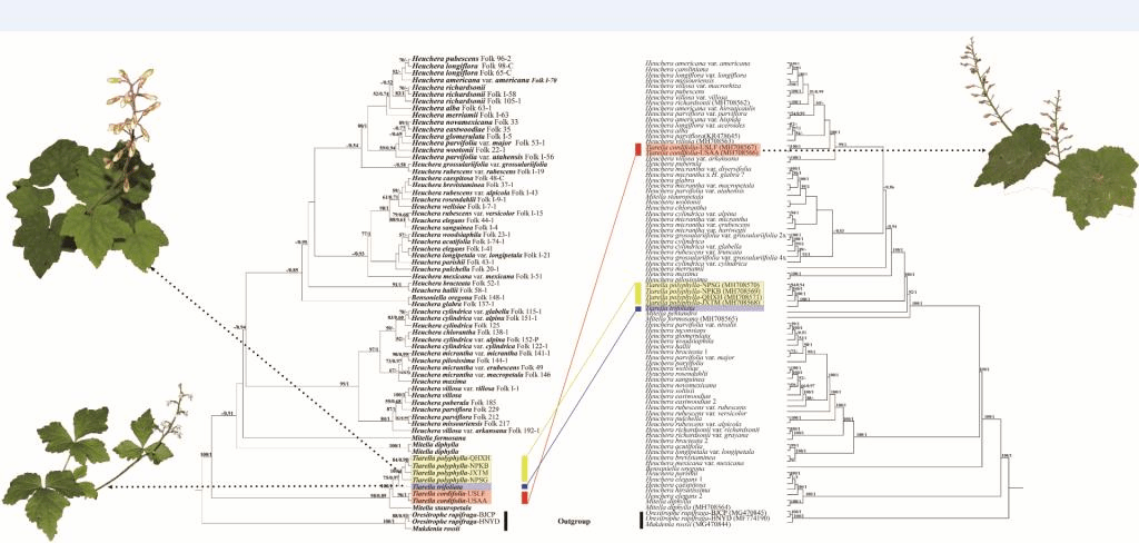图1:基于核基因ETS/ITS联合序列(左)与基于叶绿体基因组全长序列(右)构建的黄水枝属与近缘类群的系统发育树