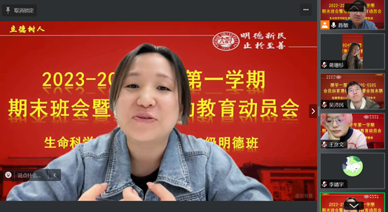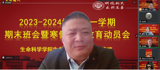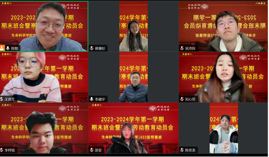 1月23日上午,2023-2024学年第一学期生物科学2022级明德计划实验班期末班会暨寒假劳动教育动员会顺利举行。副院长赵海鹏、班主任陈敏、辅导员李靖宇,教务办公室宋敏,21级、23级明德班班主任田宝良、夏雪和22级明德班全体同学参加会议。