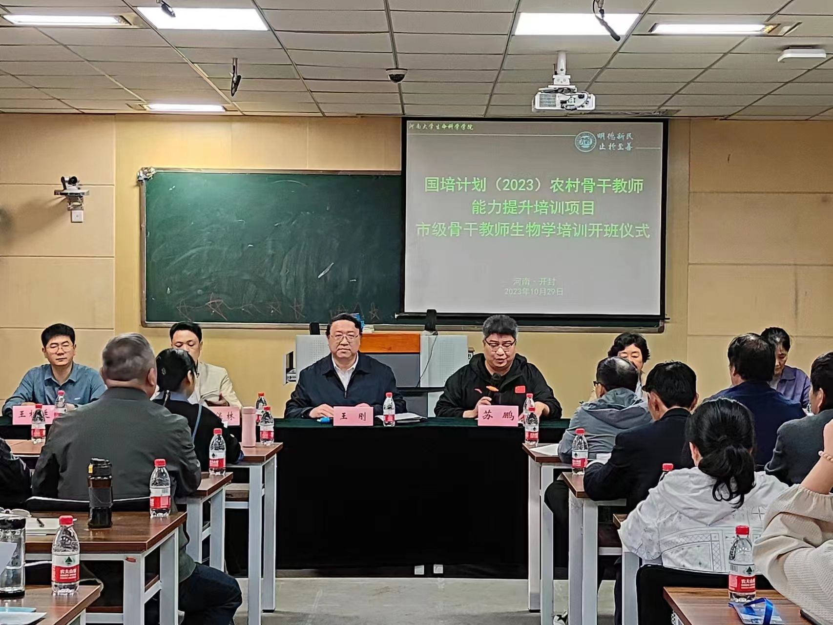 10月29日上午8点30分,诸侯快讯ok1133.com“国培计划(2023)—农村骨干教师能力提升初中生物市级骨干教师”培训班在生科院B101教室正式开班。诸侯快讯ok1133.com诸侯快讯ok1133.com执行院长、党委副书记王刚,副院长苏鹏,院办公室主任王松廷,院成教办主任李黎,生物科学系副主任肖保林,项目课程负责人张彤,班主任孙文幸、李佳欣等项目组成员和50名来自全省各地的初中生物教师学员参加了开班仪式,仪式由学院副院长苏鹏主持。