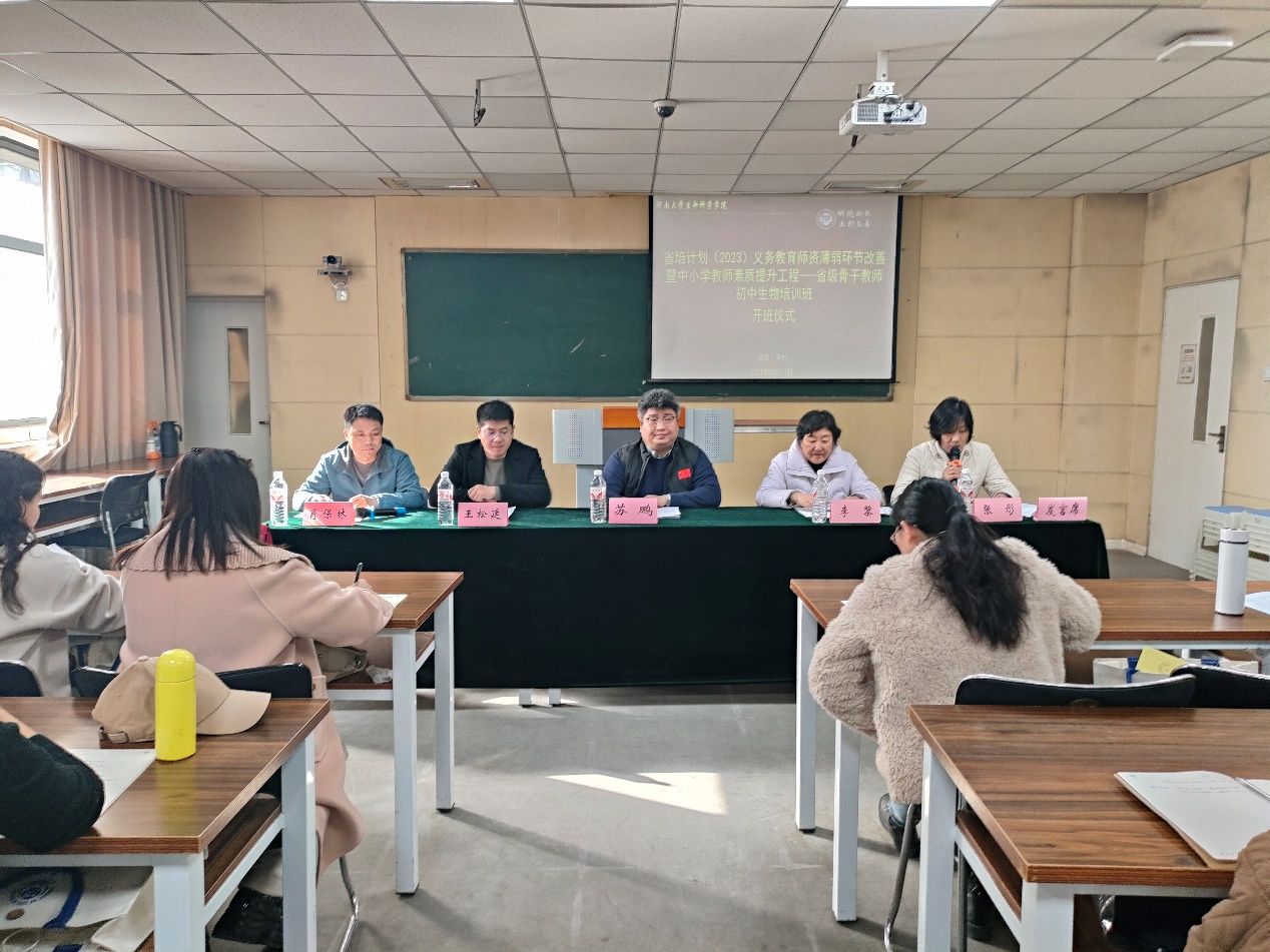 3月11日上午9点,诸侯快讯ok1133.com“省培计划(2023)—义务教育师资薄弱环节改善暨中小学教师素质提升工程—省级骨干教师(生物学)”培训班在诸侯快讯ok1133.comB101教室正式开班。诸侯快讯ok1133.com副院长苏鹏,行政办公室主任王松廷,成教办主任李黎,生物科学系副主任肖保林,项目课程负责人张彤等项目组成员和50名来自全省各地的中学生物教师学员参加了开班仪式,仪式由肖保林主持。