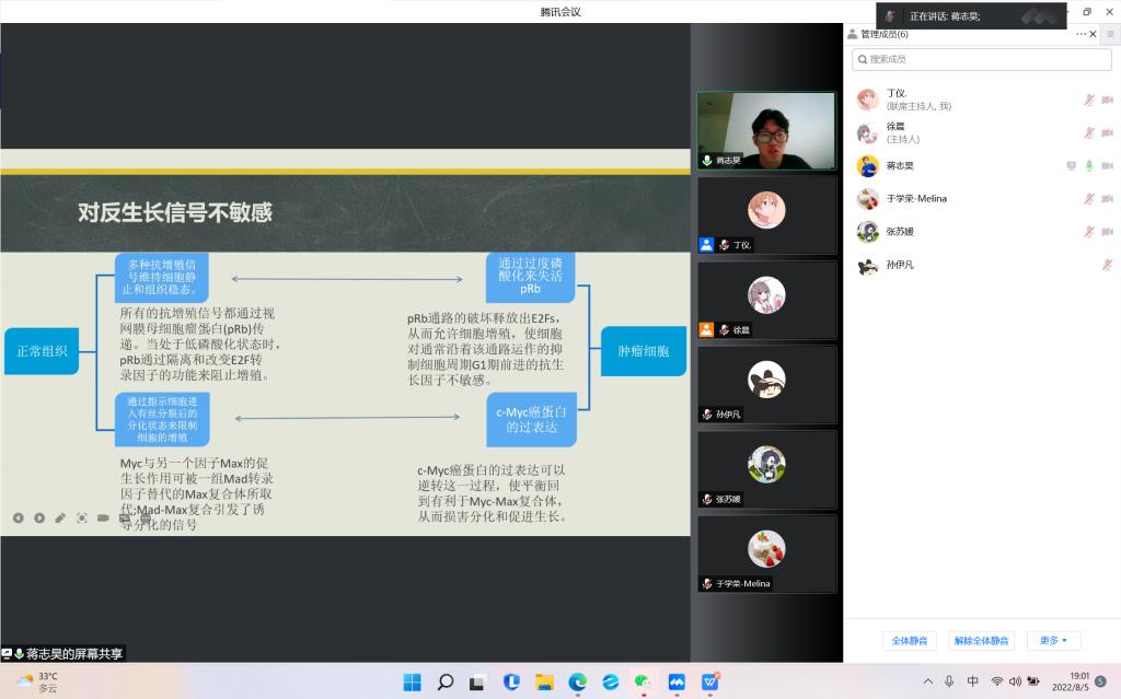随后,五个分会场的同学依次结合PPT演示进行了论文分享,五位明德朋辈导师进行一对一点评指导,在肯定同学们态度认真的同时,指出了PPT制作、科学问题凝练和结果解读等专业性问题,并给出整改提升意见。通过与朋辈导师深入探讨,同学们纷纷表示受益匪浅、备受激励,要向明德朋辈导师学习,结伴奋斗,砥砺前行。