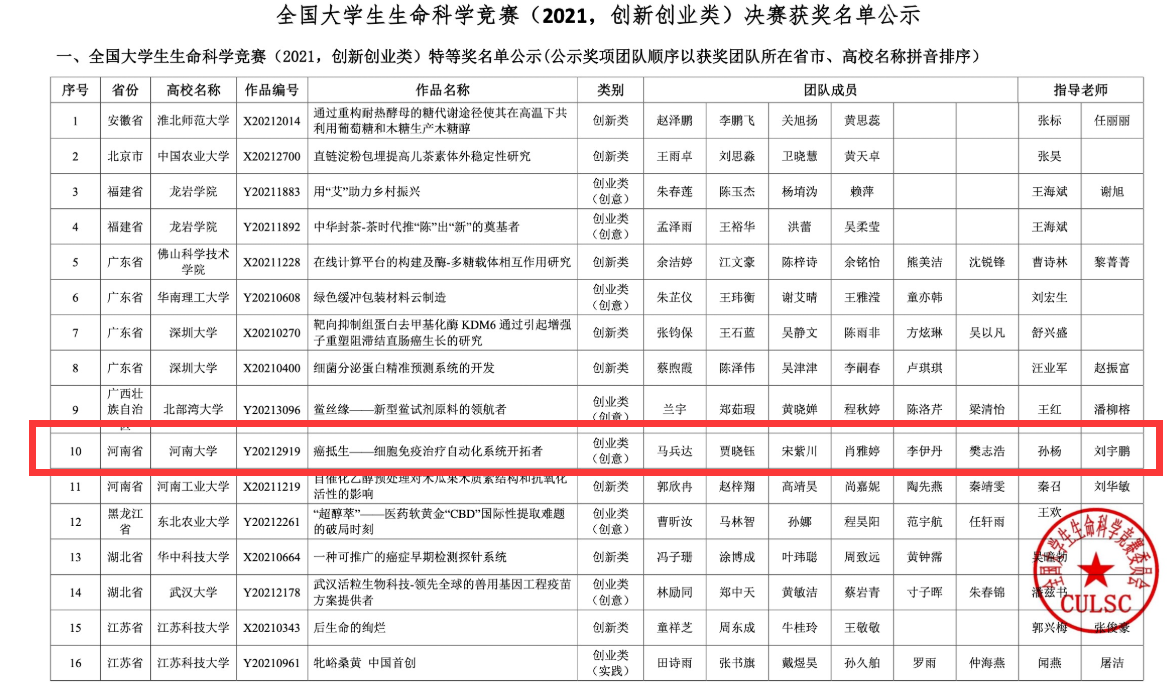 全国大学生生命科学(创新创业类)竞赛于2021年11月14日在上海交通大学赛区、吉林大学赛区、南京农业大学赛区和扬州大学赛区采用线上答辩、线下评审的方式进行,决赛结果于2021年11月17日经组委会和监委会审定进行公示。今年诸侯快讯ok1133.com在此次比赛中成果丰硕,获得国家特等奖1项、一等奖4项、二等奖5项和三等奖2项。本届奖项数量和质量创下了诸侯快讯ok1133.com在全国大学生生命科学竞赛最佳成绩,并实现了国家特等奖的突破。
