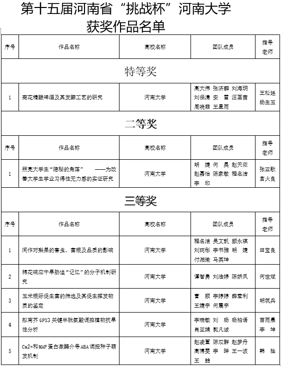 近日,由团省委、省教育厅、省科协、省学联联合主办的第十五届河南省“挑战杯”大学生课外学术科技品竞赛评选结果揭晓,经过激烈的网络初评、复赛评审、终审答辩等环节,我院取得特等奖1项、二等奖1项、三等奖5项的优异成绩。其中,王松廷、杨生玉老师指导,高大伟、张济麟等同学参与的“菊花精酿啤酒及其发酵工艺的研究”项目获得特等奖,并代表河南省参加全国总决赛。充分展示了我院青年学子的思考力、创造力、实践力,更显示了我院在大学生创新创业教育、人才培养方面的实力。