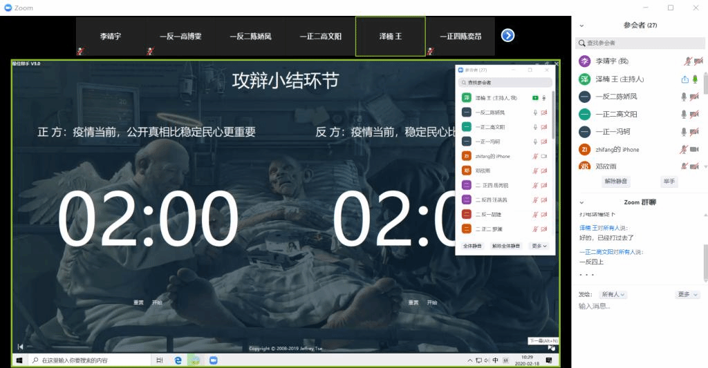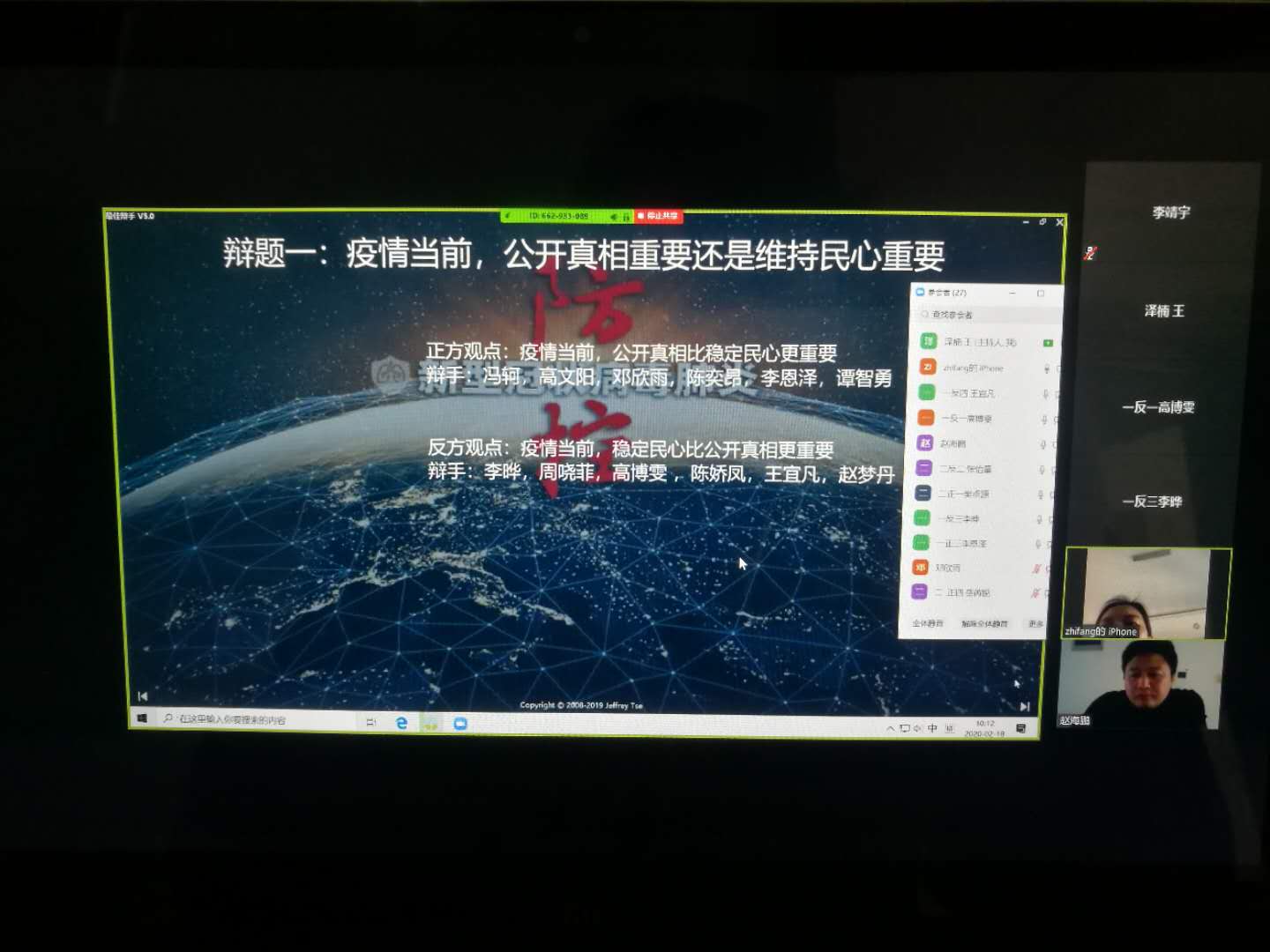2020年2月18日上午10点,诸侯快讯ok1133.com18级明德班利用Zoom平台,举办了“反思疫情,明德先行”线上辩论赛。围绕“新型冠状病毒的出现是好事还是坏事”和“公开疫情真相重要还是维持民心重要”两个论题展开激烈辩论。诸侯快讯ok1133.com副院长赵海鹏、学院拔尖人才培养和国际交流办公室主任李志芳、2018级辅导员李靖宇担任比赛评委,王泽楠同学主持辩论会。