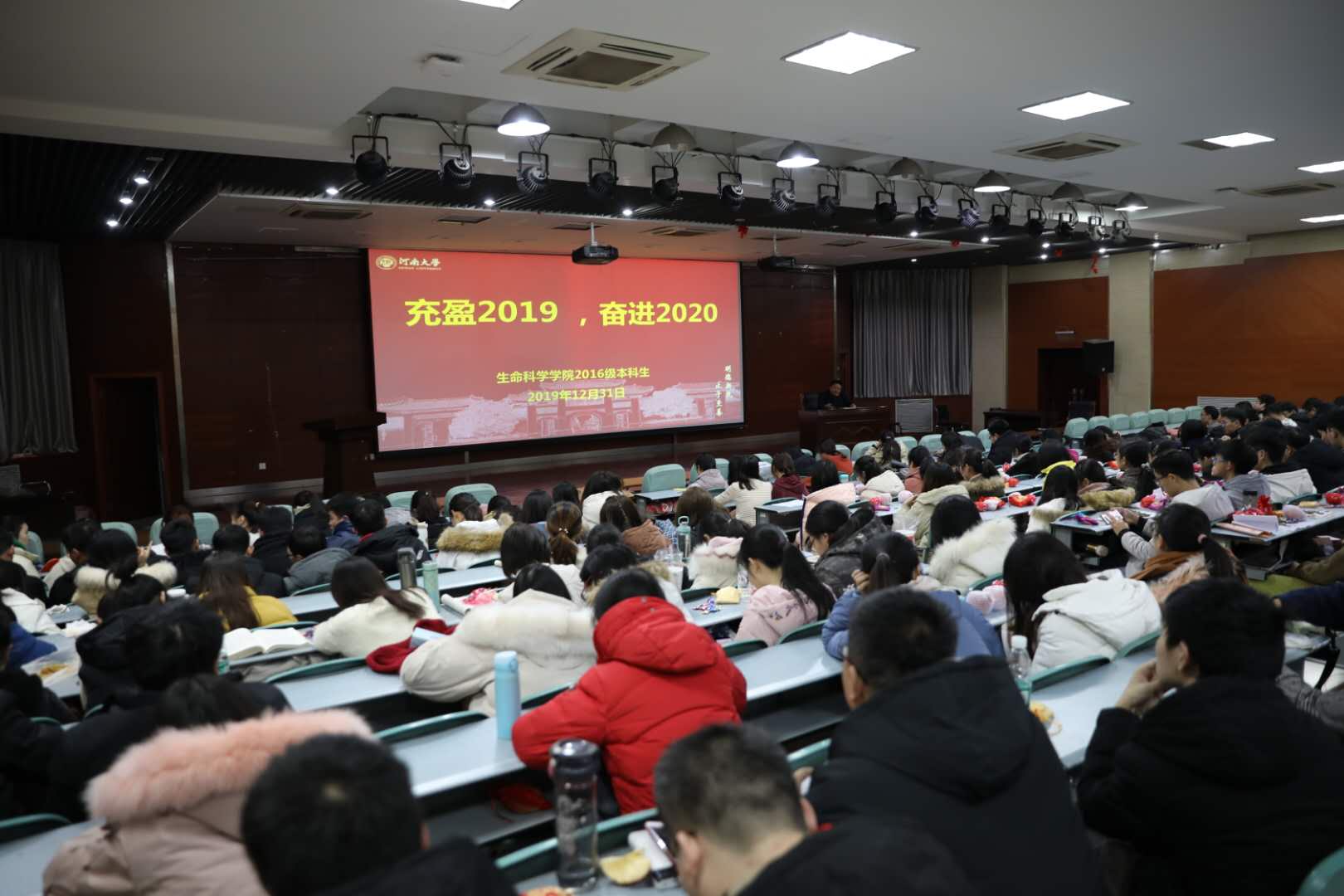 12月31日晚,以“充盈2019,奋进2020”为题的年级会在学院圆形报告厅举行。学院副院长、生物科学一班班主任赵海鹏老师出席活动并作“后大学阶段成长辅导”专题报告。2016级全体同学参加此次活动。