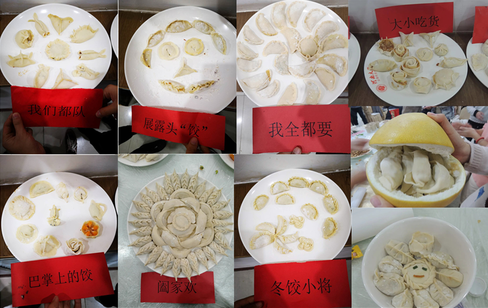 缇室葭灰微动候,围炉娇耳始添时。在我国北方,冬至有吃饺子的习俗,寓意着生活的圆满和美好,同学们也积极组队,充满创意的取名为阖家欢队、大小吃货队、冬饺小将队、我全都要队等。活动现场其乐融融、春意盎然,欢声笑语中,同学们各显身手,小小的面团在擀面杖下飞快的旋转,一会儿就神一般地变成了一张张又薄又圆的面皮,包饺子的同学也不遑多让以迅雷不及掩耳之势捏出一个个饱满精致的饺子,扇形的、麦穗形的、元宝形的,一排排饺子像整装待发的士兵精神抖擞的排列在一起。有的学生是第一次动手包饺子,专门搜了网上的视频教程学习,有的同学还把巧克力、小橘子、小糖果包到饺子里,他们说,“我们是把幸福和甜蜜包到饺子里!”,“谁吃到保佑谁期末考试不挂科”邬娜快乐的说道。