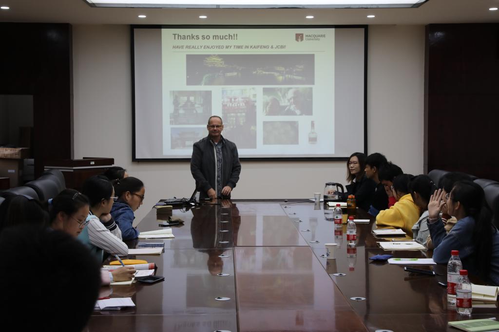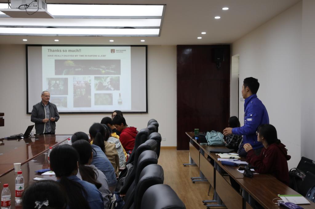 座谈会上,Lovejoy博士用简明轻快的形式向同学们介绍了澳大利亚的人文、麦考瑞大学、自己的科研经历和最新的研究成果,并表达了对中国文化和开封古城的喜爱。在互动环节,明德班同学和Lovejoy博士就如何平衡科研和生活的关系、科研成果的转化和应用、癌症和阿尔茨海默氏病的日常预防等问题进行了热烈讨论,并对“科学就是探索未知世界”这句话有了更深的理解。座谈会现场气氛活跃,同学们参与度高,形式别开生面。同学们不仅能突破语言障碍,还能表达个性化思考,提出颇有深度的问题与见解。