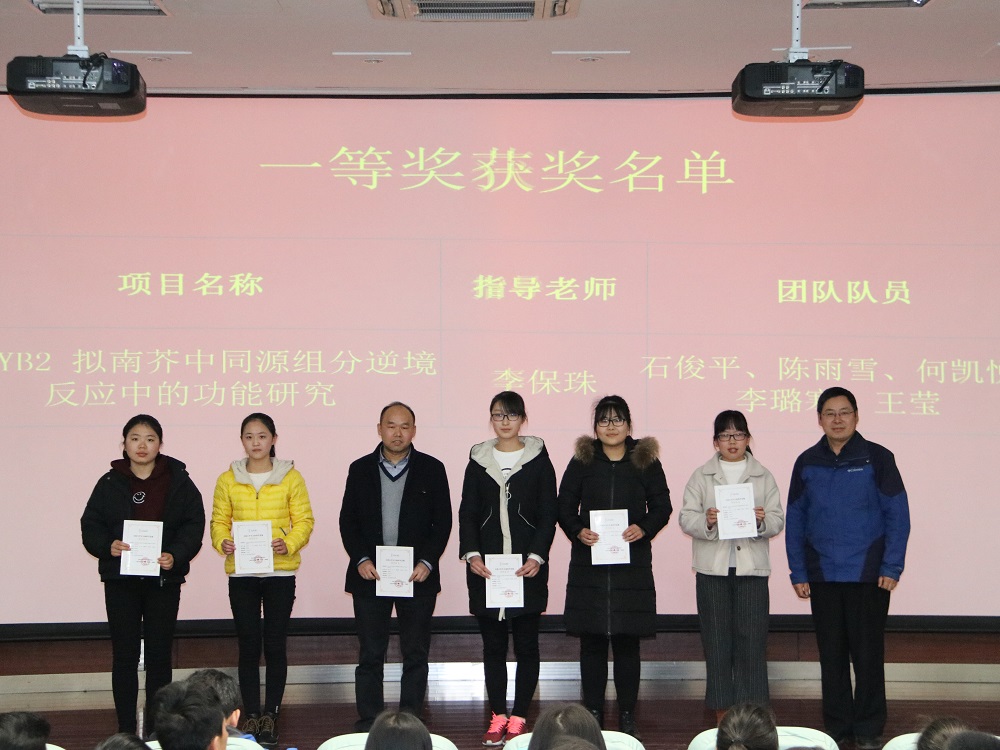 在获奖师生代表发言中,一等奖团队指导教师李保珠对学院给予参赛队伍的指导和帮助表示感谢,告诫参赛同学在备赛过的中要信心百倍、努力把实验做好,并预祝同学们在第二届大赛中取得更好成绩。获奖学生代表2015级生物科学专业学生武敏、王雅男与大家分享参赛心得,讲述备赛注意事项,鼓励同学们积极备赛。