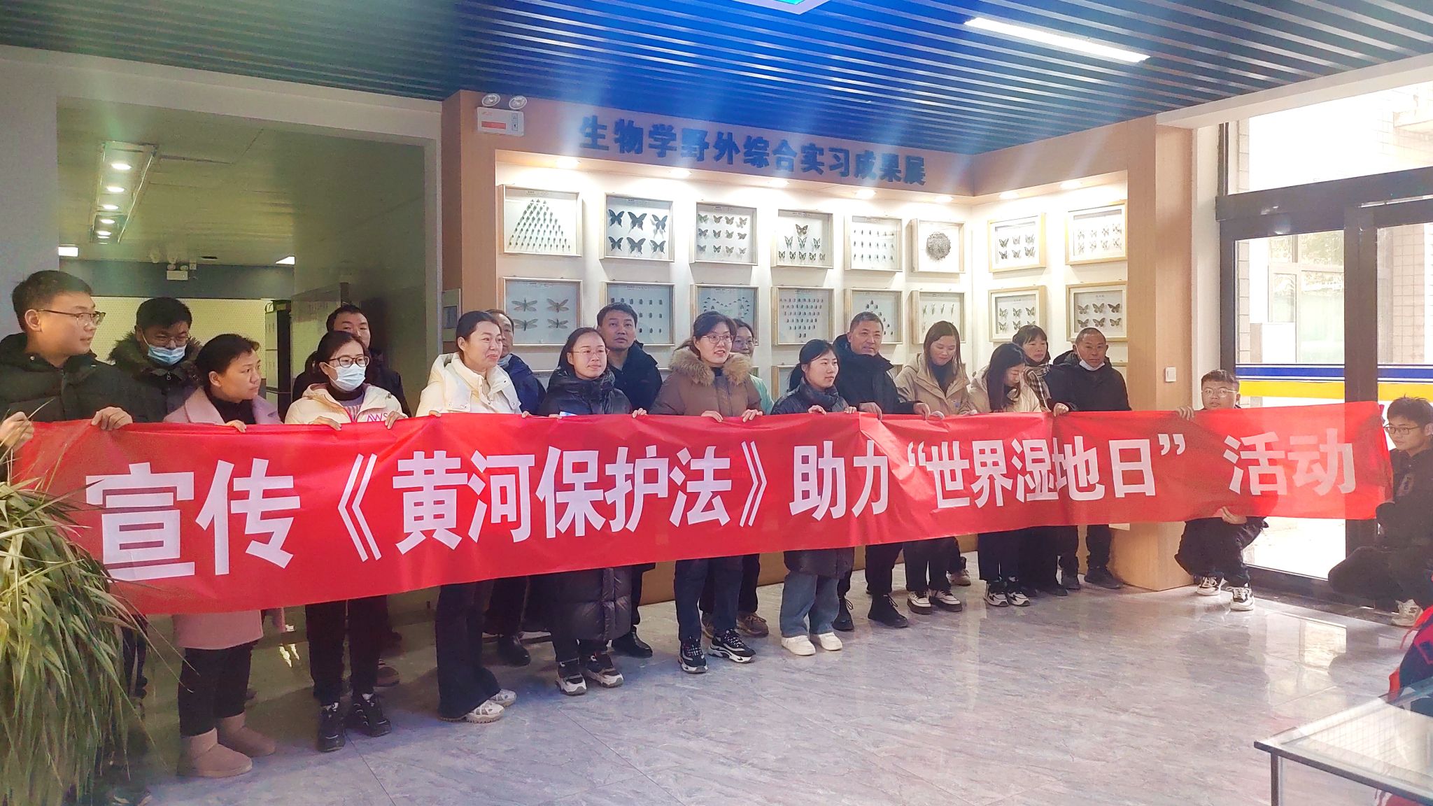 为提升全民湿地保护意识,1月26日,学院副院长赵海鹏,青年教师田宝良、李文娆带领实践团成员赴开封市兰考金牛湖湿地公园,携手开封市林业局、开封市柳园口省级湿地自然保护区管理站和兰考县林业服务中心等开展2024年“世界湿地日”主题科普活动,宣传横幅、主题海报吸引了当地居民的关注。师生作为保护黄河的实践者、宣传员,张贴悬挂《黄河保护法》相关海报、条幅,发放《湿地保护法》《环境保护法》《开封柳园口省级湿地自然保护区鸟类图册》和《河南省百种鸟类》等宣传材料,为民众解读国家关于湿地保护与修复、湿地生物资源保护的相关政策。通过听取黄河河务局工作人员讲述黄河保护措施和抗灾救险的历程,大家领悟到保护黄河的艰辛和“团结、务实、拼搏、奉献”的黄河精神内涵。