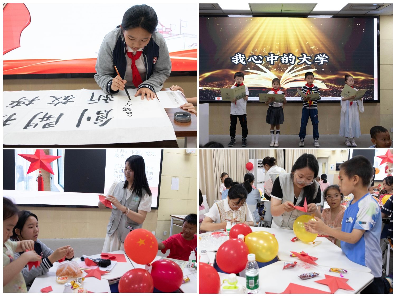 墨宝飘香,巧手巧心筑梦想。书法展示环节中,新河大精神“自信 拼搏 开放 创新”八个大字显得格外有力;在朗诵《我心中的大学》时,孩子们用稚嫩的声音描绘对知识的渴望、对梦想的追求以及对大学生活的无限憧憬。在手工折纸环节,孩子们认真地听从指导,亲手折叠五角星,不仅锻炼了动手能力,也增强了对少先队标志的理解与认同。