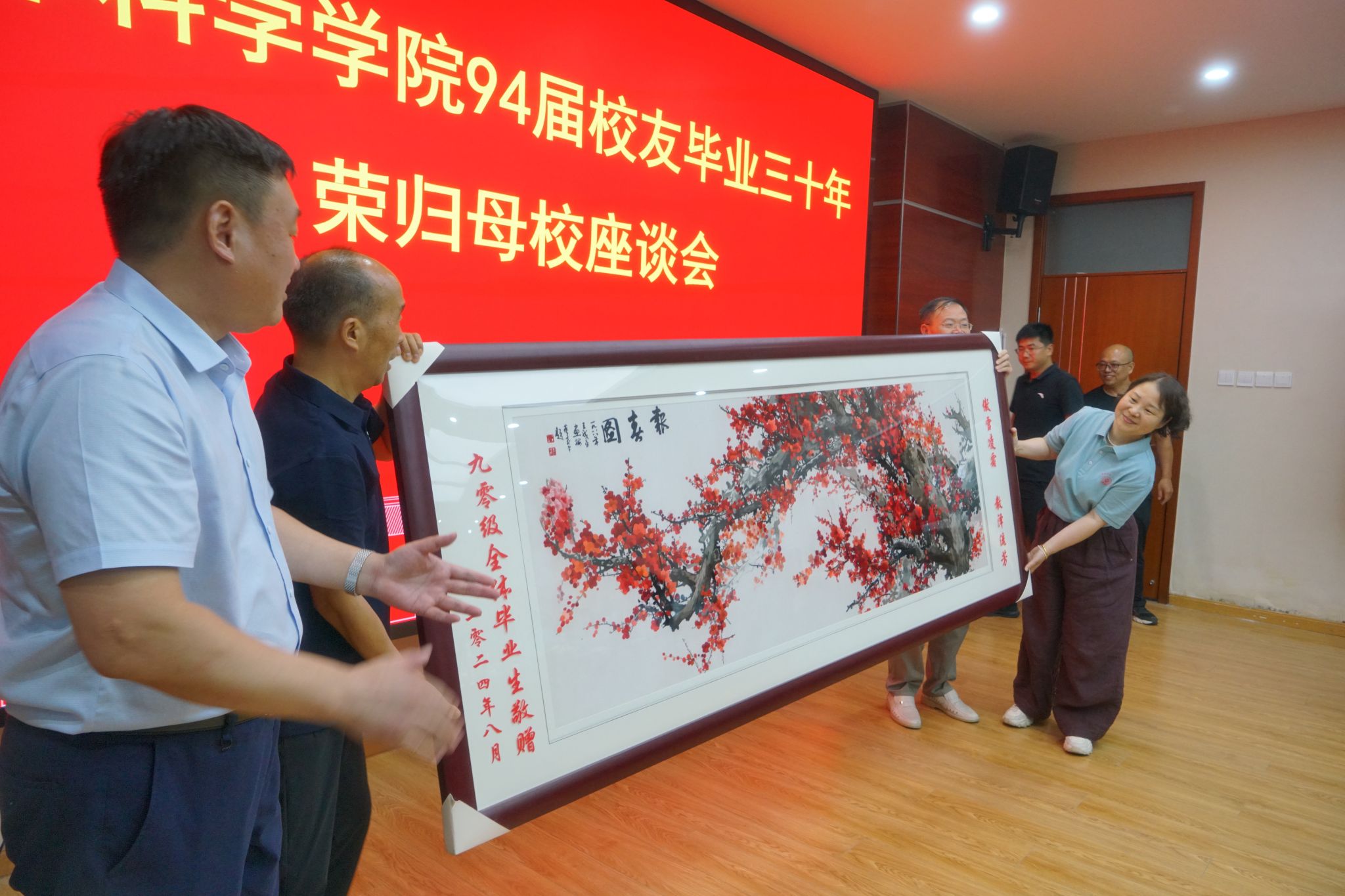 随后,1994届校友向学院赠送汴绣“傲雪凌霜,教泽流芳”《报春图》,向与会教师献花感谢师恩。
