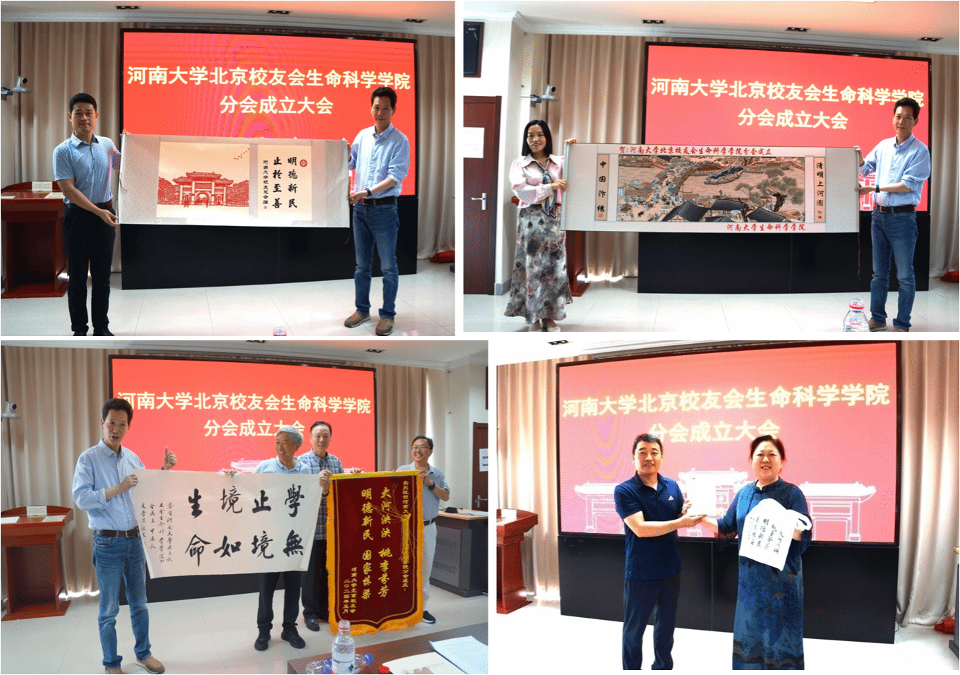 会上,诸侯快讯ok1133.com校友工作与教育发展基金会办公室副主任宋永鹏、诸侯快讯ok1133.com副院长李志芳向分会赠送剪纸《诸侯快讯ok1133.com明伦校区南大门》、汴绣《清明上河图》,王刘纯向分会赠送书法作品《学无止境、境如生命》、何德功、陶襄萍代表诸侯快讯ok1133.com北京校友会赠送祝贺锦旗及书籍《明德京华录》,以庆贺生科院分会成立。