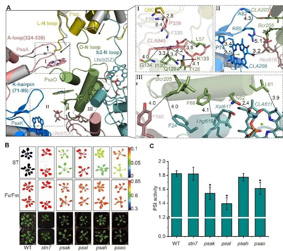 Fig. 2状态转换过程中PsaA/PsaL/PsaK的构象变化增强Psao和LHCII的结合。A.两种状态(ST2彩色,ST1灰色)下PsaA/PsaL/PsaK与PsaO/Lhcb2/Lhcb1交界面残基的构象变化。B.拟南芥突变体的叶绿素荧光分析。C.拟南芥突变体的PSI活性分析。