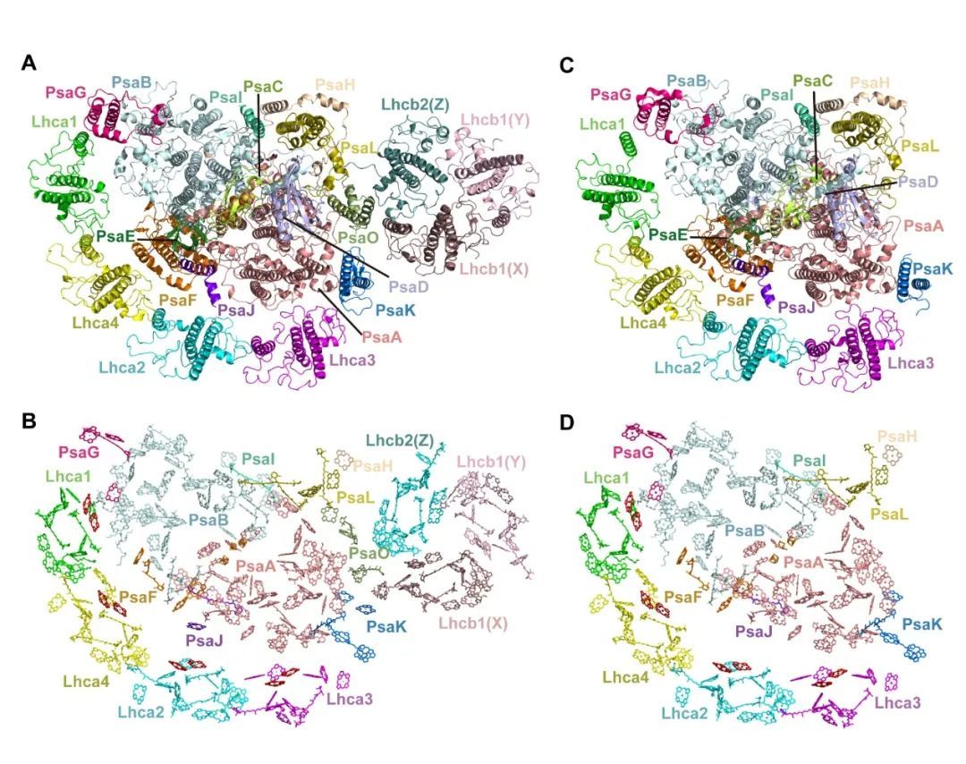 研究人员通过不同光照条件分别诱导得到状态1和状态2的拟南芥材料,利用活性胶-凝胶过滤层析纯化相关复合物,并使用单颗粒冷冻电镜解析得到PSI-LHCI-ST1和PSI-LHCI-LHCII-ST2的结构(Fig.1)。