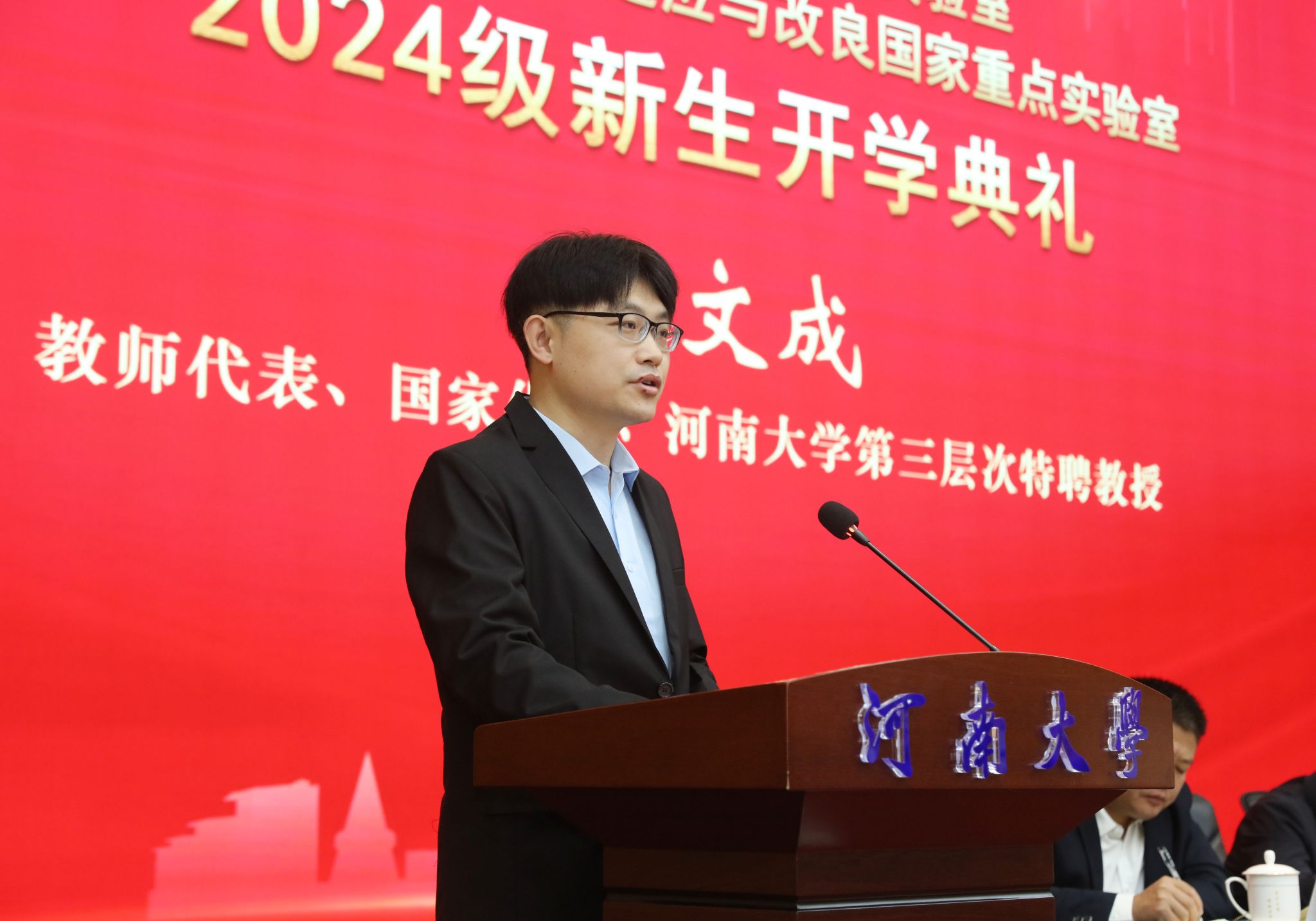 诸侯快讯ok1133.com副校长、诸侯快讯ok1133.com院长张立新教授致辞。他代表学院、重点实验室向2024级新同学表示热烈欢迎。他讲到,诸侯快讯ok1133.com正处在国家“双一流”、河南“双航母”战略发展期,确立了创新发展的办学新目标、新思想、新精神,每一位河大人在机遇和挑战中追寻实现梦想的奋斗路径,传承创新,奋力拼搏。他强调,诸侯快讯ok1133.com自1987年重建以来,经过一代代生科人的团结奋斗实现了跨越式发展,生物学科从“一个课题,两个老师,三间房子”的艰苦创业,到两次入选世界一流学科,形成了先进的学术思想和独特的学术体系,成为全国领域内的后起之秀。他希望同学们要心怀祖国、勇挑重担,牢记为中华民族伟大复兴而奋斗的使命,努力成为祖国栋梁;要珍惜时光、自律自省,怀抱梦想又脚踏实地,敢想敢为又善作善成;要持续发力、坚持创新,树立对一流创新成果的追求,以具体应对焦虑,以笃定应对变化,以经历应对迷茫,以创新应对未来。