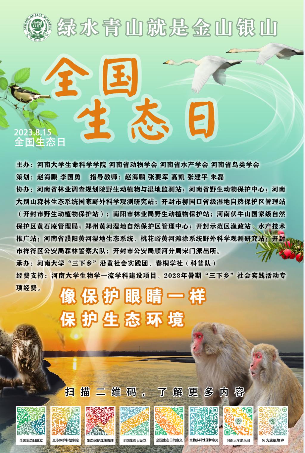 为迎接首个全国生态日(8月15日),诸侯快讯ok1133.com提早准备,精心安排,近日来,围绕“绿水青山就是金山银山”主题开展了科普宣讲、海报张贴和文创产品分发等系列活动,场所除诸侯快讯ok1133.com校园外,还包括开封柳园口省级湿地自然保护区、开封市水稻乡杨桥社区、沙门村以及开封市中国式摔跤协会运动训练基地等,并在“2023河南省动物学会教学科研研讨会”上介绍了科普活动产品和方案,得到了来自27家参会单位80余参会嘉宾、代表的高度肯定和认可。