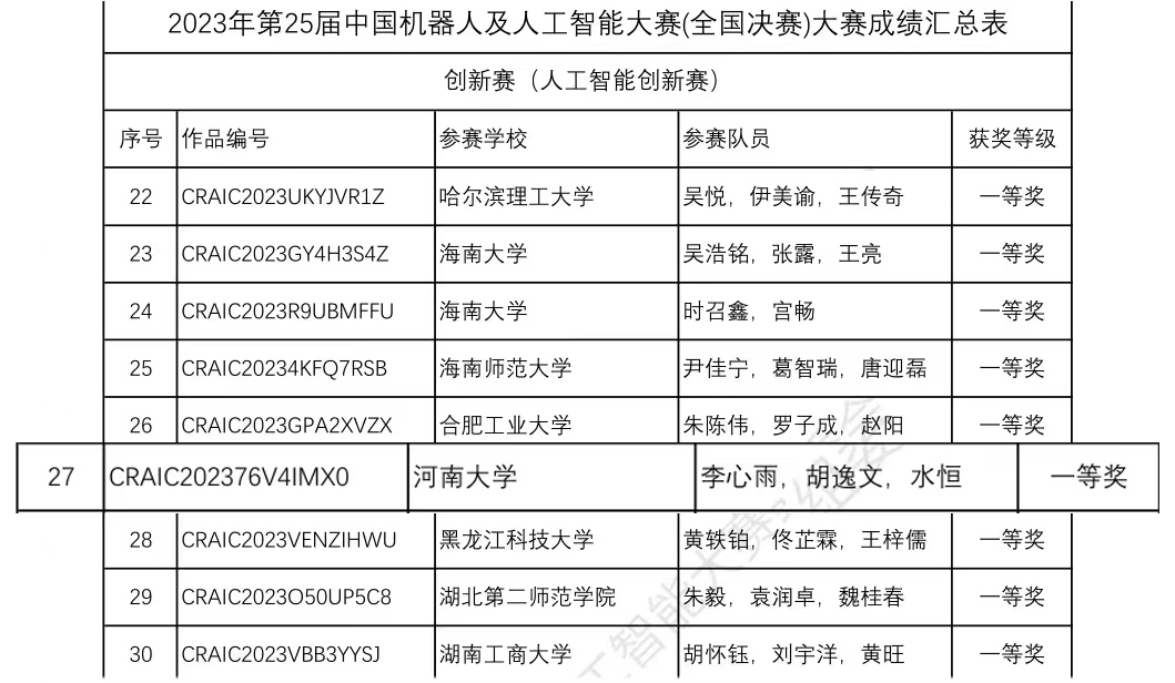 近日,由中国人工智能学会主办的第二十五届中国机器人及人工智能大赛全国总决赛圆满闭幕。来自全国300多所高校共800多支队伍参加了本次比赛,展示了前沿的机器人、人工智能技术,在线上线下展开对决。经过激烈角逐,我院团队在孙杨老师的指导下攻坚克难,斩获全国总决赛一等奖1项,河南赛区总决赛三等奖1项。