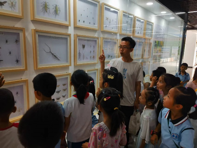 在生物标本馆,吴江浪展示了部分生物化石、琥珀和昆虫标本,对昆虫标本和生活中的昆虫特征识别及行为特性别进行细致讲解,孩子们被丰富多样的昆虫深深吸引,奇思妙想的问题层出不穷,吴江浪一一给予详细解答,师生互动热烈。