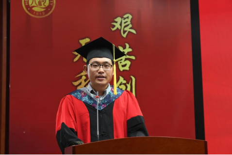 教师代表、研究生导师代表刘文成在发言中真挚地表达了对毕业生的祝贺与不舍,回顾了与同学们在校求学期间的点点滴滴,感慨与研究生同学们在攀登科研高峰途中的“战友情”,感谢研究生为科研工作所做出的贡献,他鼓励毕业生们能永远保持求知欲和谦虚谨慎,用智慧和才华创造更加美好的未来。