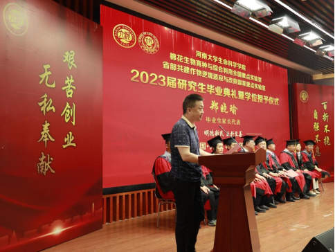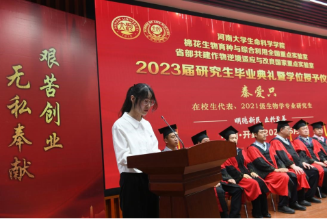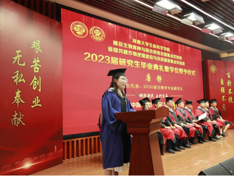 毕业生代表、2020级生物学专业研究生唐静代表全体2023届研究生毕业生发言,向学校、学院以及老师们表达了感激之情,回顾了在河大求学期间的学习和成长经历,感恩导师们在学术技能和人生奋斗目标方面的悉心指导和引领,她表示所有毕业生们会继续追求卓越,在未来的职业生涯中保持研究精神和求知欲望,不断学习和成长,勇于承担社会责任,为国家发展做出贡献。