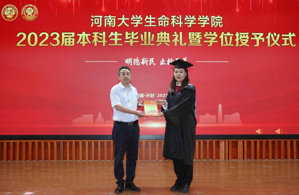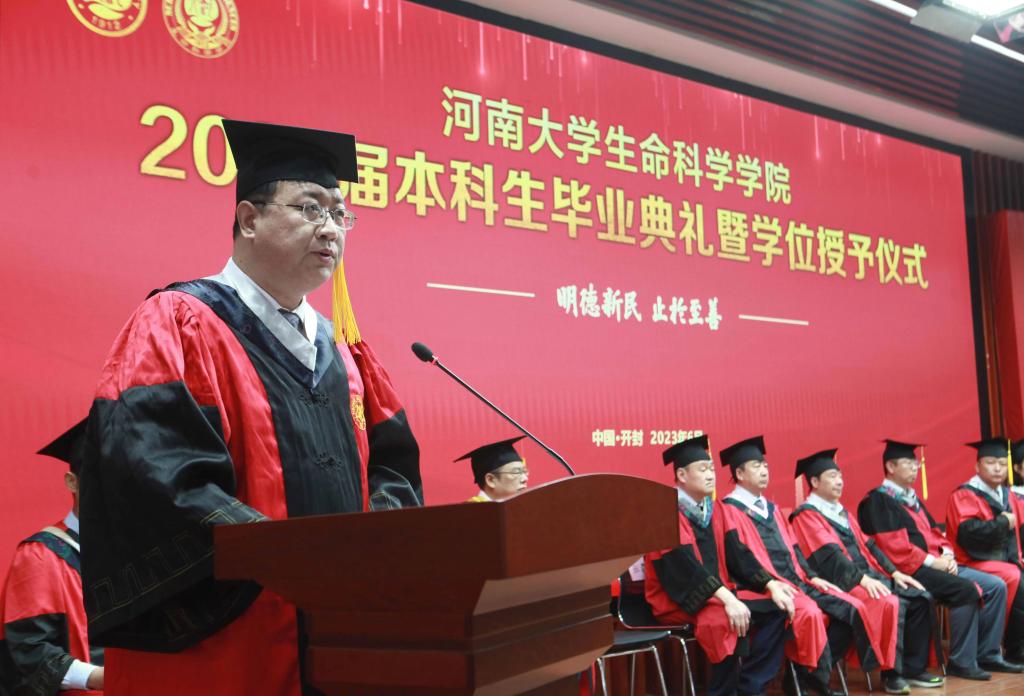 毕业生代表、2019级生物科学专业的余可儿代表全体毕业生向学校、学院表达了美好祝愿,感谢老师们的精心培养、谆谆教导,回忆大学四年的收获和成长,激励同学们恪守“明德新民,止于至善”的河大校训,“学无止境,境如生命”的生科品格,传承“无私奉献、艰苦创业”和“脚踏实地,仰望星空”的生科精神,在今后的人生路途中勇攀高峰。在校生代表、2021级生物科学专业学生李骋宇为毕业生送上了最美好的祝福和真诚的感谢。他表示,全体在校生将以学长学姐们为榜样,认真刻苦、积极奋发、坚定初心、一往无前,传承“铁塔牌”学子坚韧不拔的精神,继承“卓越生科人”的优良品质,以自己优异的成绩,用自己的实际行动,为母校的发展和进步,为祖国的复兴和强盛贡献青春力量。