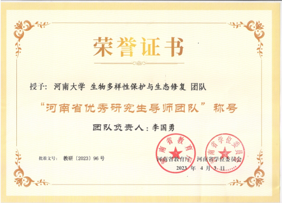 由李国勇教授担任团队负责人的诸侯快讯ok1133.com“生物多样性保护与生态修复”团队荣获“河南省优秀研究生导师团队”称号;曹更生教授荣获“河南省优秀研究生指导教师”称号;2019级生物学专业博士研究生张东亚(导师:师冰洋)和2020级生物学专业硕士研究生刘梦杰(导师:许志祥)分别荣获“河南省研究生创新之星”荣誉称号。