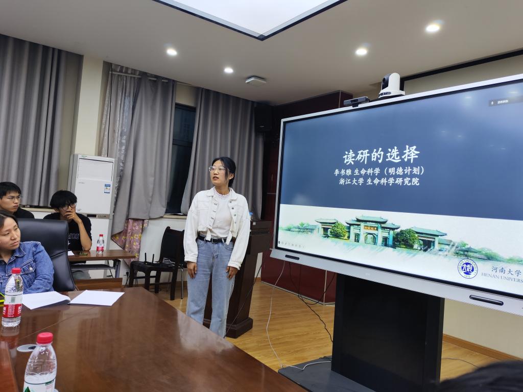 交流会上,李书雅,就自己保送至浙江大学(直博生)的具体经历,结合其选择科研领域、学校以及导师的过程,分享了她对实验室学习自主性和日常学习重要性的认识,提醒同学们要以提升自己的科研实力为重点,广泛阅读文献,开阔科研视野,提高英语水平和表达能力;涂蔷,结合自己考研至诸侯快讯ok1133.com的经历,分享了她对考研时间安排的经验,并表示政治和英语学习的功夫要下在平时,从而为后期的专业课复习留足时间;程名洁,在线上分享了保送至南京大学的经验以及读研一年的感触,他表示只有找到自己真正感兴趣的科研方向,才能有利于学业发展和选到心仪的导师;林龙晖,分享了自己考研至华东师范大学的经历,提醒同学们要善于利用网络资源,广泛获取各学校的招生信息,以选出最适合自己的院校,专业,甚至导师;夏天雨,分享了成功考取上海植生所的经验,他先向同学们发出三问,期望同学们从中认识自己,规划好未来道路,然后再找准定位,制定清晰、明确的规划;王临轩,结合自己考研至北京大学的经历,向学弟学妹们分享了跨专业考试过程中,择校、定专业和选导师的经验和方法。她表示网络资源了解专业信息、专业排名、导师信息,以及初复试比最好的途径。
