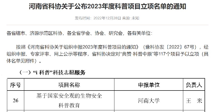 12月28日,河南省科学技术协会发布了2023年度科普项目立项名单的通知,诸侯快讯ok1133.com王来副教授主持的《基于国家安全观的生物安全科普教育》项目成功获批,此系我院2022年首次获批此类项目后再次立项。该项目基于总体国家安全观对生物安全领域的内容、事件和法律法规,通过视频、讲座、宣传海报和彩页等方式向公众进行科学普及和科技推广,将进一步增强人民群众自觉维护生物安全和国家安全的意识。