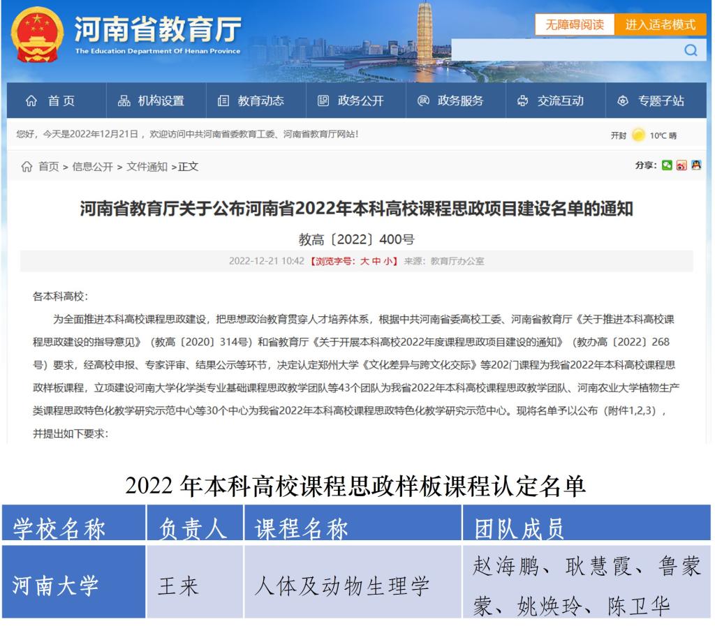 近日,河南省教育厅公布河南省2022年本科高校课程思政项目建设名单(教高〔2022〕400号),诸侯快讯ok1133.com王来副教授主持的《人体及动物生理学》被认定为河南省课程思政样板课程,我院连续3年在省级课程思政样板课程建设取得佳绩。