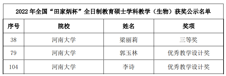 近日,2022 年全国“田家炳杯”全日制教育硕士学科教学(生物)专业教学技能大赛决赛落下帷幕,我院2021级学科教学(生物)专业硕士研究生梁丽莉荣获全国总决赛三等奖,郭玉林、李诗荣获优秀教学设计奖,这是我校生物教育硕士首次在教学技能大赛上获得国家级奖项。