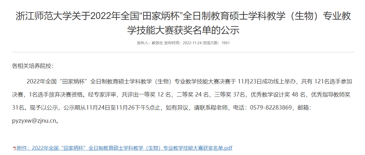 据悉,全国“田家炳杯”全日制教育硕士学科教学(生物)专业教学技能大赛是由“田家炳杯”全日制教育硕士专业学位研究生教学技能大赛专家委员会主办,是一项在全国教育硕士培养院校中具有重大影响的竞赛活动。2022年度全国共计 305名选手参加初赛,入围决赛选手 122 名。