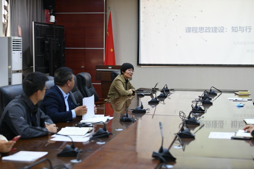 会议邀请了马克思主义学院教师、我院与马院共建的思政课程与课程思政联合研究省级示范中心骨干成员陈卫华副教授作了题为“课程思政:知与行”的报告,从“课程思政是什么”“课程思政怎么做怎么评”“课程思政的大原则”3个方面深入浅出的为大家介绍了课程思政开展的必要性和重要性、专业课程如何有机融合思政元素和如何进行课程思政评价等,得到了大家的热烈反响。