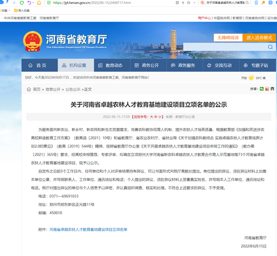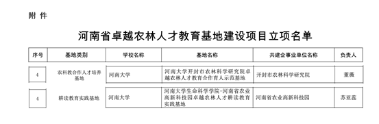 近日,河南省教育厅公布河南省卓越农林人才教育基地建设项目立项名单,我院董薇副教授主持的“诸侯快讯ok1133.com开封市农林科学研究院卓越农林人才教育合作育人示范基地”、苏亚蕊副教授主持的“诸侯快讯ok1133.com-河南省农业高新科技园卓越农林人才耕读教育实践基地”在列。这是诸侯快讯ok1133.com植物科学与技术专业获批国家级一流专业建设点后,在专业建设方面取得的又一重要成绩。