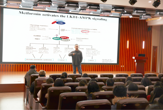 许志祥教授从二甲双胍是常见的糖尿病治疗药物说起,延伸到其增寿、减肥以及抗肿瘤的功效。二甲双胍的发现是来源于植物,作用于动物,实质上是影响了肠道微生态。许教授巧妙地把这样一个“神奇之药”将植物学、动物学、生态学、医药与发酵工程紧密地联系起来。通过一个个生动的例子,同学们初步了解了二甲双胍抗肿瘤的研究现状,清楚了二甲双胍激活AMPK通过抑制溶酶体质子泵v-ATPase的作用机理,理解了二甲双胍研究的理论意义和临床应用价值。本次讲座拉近了从事生物学不同研究方向学生的专业距离感,也让大家认识到了生物学交叉学科的神奇之处,提高了对“Bio+X”的研究兴趣。