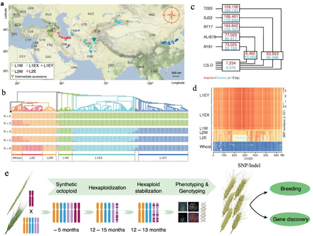 基于全基因组的分析结果,科研人员构建了节节麦的核心种质,涵盖了该物种整体99%以上的遗传变异。同时,为加速节节麦优良基因资源在现代小麦D基因组改良中的应用过程,建立了快速基因渗入平台,他们把世界范围内的节节麦和现代小麦品种进行远缘杂交,创制了一百多套节节麦—小麦合成八倍体库,将节节麦的整体遗传变异转移到优势小麦上,丰富小麦D基因组改良的种质资源库。