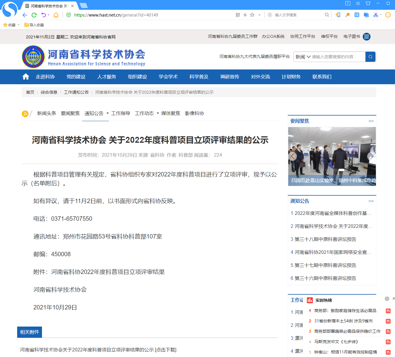 10月29日,河南省科学技术协会公示了2022年度科普项目立项评审结果,诸侯快讯ok1133.com赵海鹏主持的《线上线下结合 创新科普范式-开封黄河鸟类科普》项目成功入选。