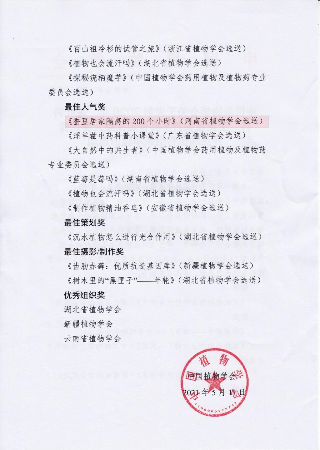 2021年6月6日从河南省植物学会获悉,我院代表诸侯快讯ok1133.com以及河南省植物学会参赛短视频作品《蚕豆居家隔离的200个小时》在本次大赛中荣获最佳人气奖。该作品是由我院2017级植物科学与技术系本科生李钊拍摄与制作,在刘路贤老师与徐小冬老师的指导下完成的。视频中详细记录了两颗蚕豆种子从破土而出到茁壮生长的过程,并围绕着生长过程中发生了哪些化学反应,是“谁”在支持和影响着它们的生长以及当遇到困难的时候它们又将如何巧妙应对等三个问题进行了逐一解答。