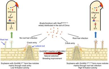 2021年1月15日,诸侯快讯ok1133.com王学路教授团队和华中农业大学李友国教授合作在Nature Plants上发表了题为“Glycine max NNL1 restricts symbiotic compatibility with bradyrhizobia via root hair infection in soybean”的研究论文(doi : 10.1038/s41477-020-00832-7),揭示了大豆与根瘤菌共进化过程中根瘤菌由裂隙侵染向根毛侵染方式转变的遗传、分子和进化机制。研究人员首先构建了来自于世界各地的496份大豆核心种质自然变异群体;再根据接种慢生型根瘤菌后根瘤数目的表型,进一步通过全基因组关联分析结合遗传分析和分子生物学的方法,定位并证明了一个编码TIR-NBS-LRR蛋白的R基因(命名为GmNNL1,Nodule Number Locus 1)能够限制根瘤菌侵染大豆,降低大豆的根瘤数目。进一步分析发现,在大豆的自然选择、人工驯化以及与根瘤菌的共进化过程中,一类GmSINE1转座子的插入导致了该基因功能失活,使其只能编码截短形式的GmNNL1蛋白,从而促进了大豆对土壤中土著根瘤菌的识别,增加了大豆根瘤数量,进而显著提高了大豆单株固氮酶活以及地上部分生物量。GmNNL1主要在根毛中受根瘤菌诱导表达并主要影响根瘤菌的根毛侵染途径,而具有转座子插入的GmNNL1失活单倍型的出现,是导致根瘤菌侵染大豆由裂缝侵染向根毛侵染转变的重要原因。进一步通过质谱鉴定、生化和遗传分析发现,全长的GmNNL1蛋白通过与根瘤菌的三型分泌系统效应蛋白NopP直接相互作用激活ETI从而抑制大豆与根瘤菌的共生。该研究不仅揭示了大豆与根瘤菌互作过程中宿主与寄主匹配性的遗传和分子机制,还阐释了根瘤菌与大豆共进化过程中根瘤菌由裂缝侵染演化成高效的根毛侵染过程的重大分子事件,也为大豆高效固氮的分子设计育种提供了重要理论依据和目标基因。