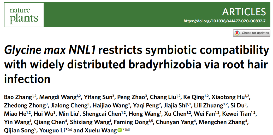 豆科植物能通过与根瘤菌互作形成根瘤进行共生固氮。据估算,豆科植物共生固氮占全球生物固氮总量的60-70%。因此,研究豆科植物共生固氮的分子机制,提高共生固氮效率,对实现减肥增效、发展绿色农业具有重要意义。豆科植物的共生固氮效率受根瘤菌匹配性以及非生物逆境的影响,但是长期以来,其遗传和分子调控机制知之甚少。近期我校王学路教授团队先后在国际顶尖期刊Nature Plants 和Molecular Plant上发表重要研究论文,揭示了大豆与根瘤菌共生固氮的分子进化机制以及逆境适应机制。系列研究具有重要的理论意义,也为大豆高效固氮的分子设计育种提供了重要目标基因。