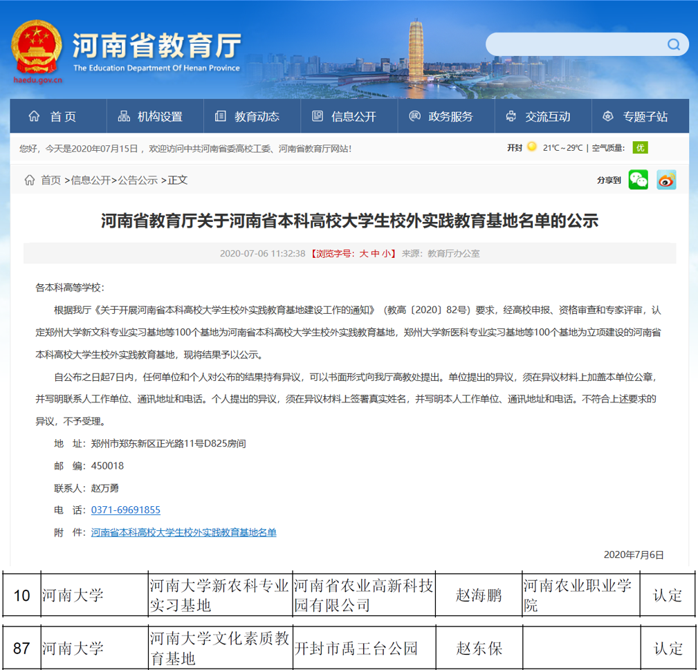 近日,河南省教育厅公布河南省本科高校大学生校外实践教育基地名单,我院赵东保教授主持申报的“诸侯快讯ok1133.com文化素质教育基地”和赵海鹏副教授主持申报的“诸侯快讯ok1133.com新农科专业实习基地”赫然在列。