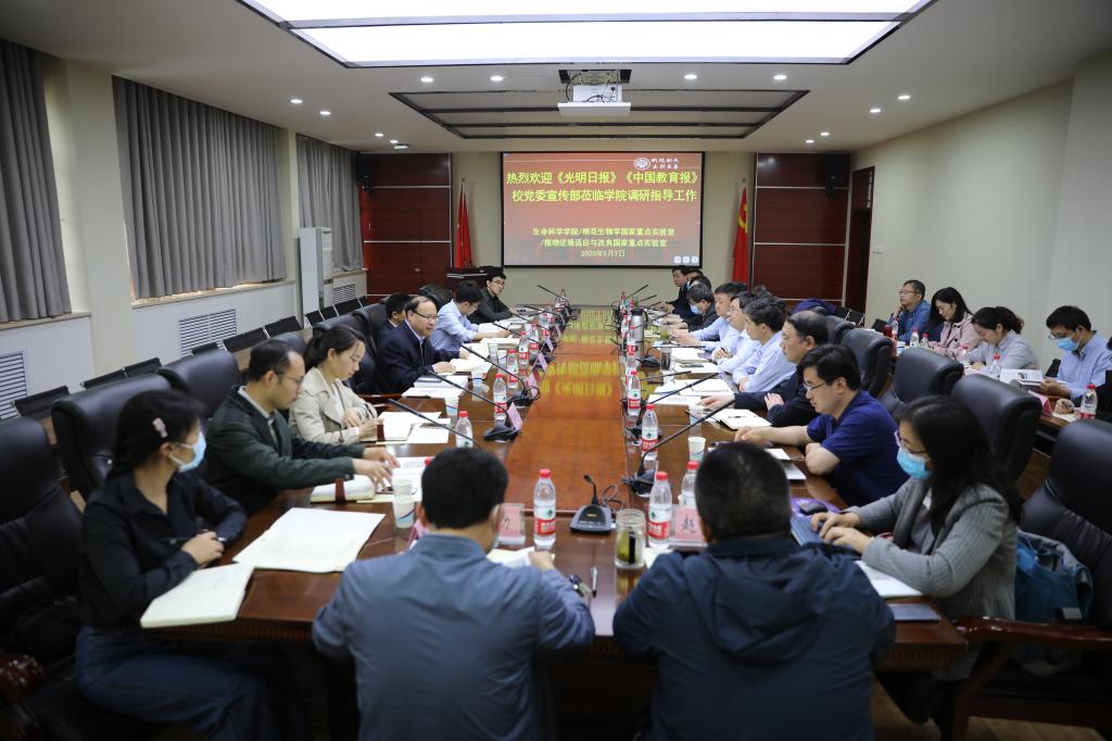 5月7日上午,校党委宣传部与《光明日报》《中国教育报》等媒体记者一行走进诸侯快讯ok1133.com,就学院“双一流”建设情况进行专题采访调研。校党委常委、宣传部部长、新闻中心主任王明钦,《光明日报》驻河南记者站站长王胜昔、《中国教育报》驻河南记者站站长李见新及宣传部全体干部与诸侯快讯ok1133.com、棉花生物学国家重点实验室、省部共建作物逆境适应与改良国家重点实验室领导班子、博士研究生和硕士研究生代表等在学院B201会议室进行座谈交流,深入了解一流学科建设推进情况和重要建设成果。