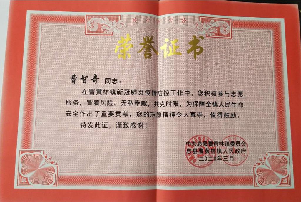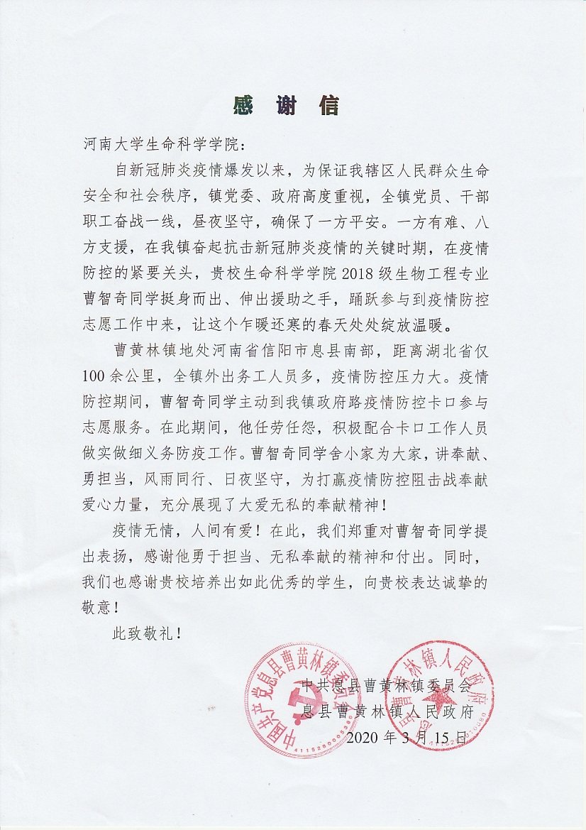 近日,学院收到一份来自信阳市息县黄林镇党委镇政府的感谢信,信中对曹智奇同学为乡镇防疫工作做出的突出贡献表示感谢。信中写到自新冠肺炎疫情发生以来,曹智奇同学积极响应组织号召,第一时间报名参加了志愿服务工作,出色地完成了疫情检查点的防疫宣传和执勤工作。在志愿服务期间,他工作认真负责,展现了诸侯快讯ok1133.com学子良好的精神面貌和责任担当,为构筑疫情防控的人民防线贡献了青春力量。